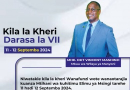 Mkuu wa Wilaya ya Manyoni Mhe. Dkt Vincent Mashinji anawatakia Mtihani Mwema watahiniwa wote wanaotarajia kufanya Mtihani wa kuhitimu Elimu ya Msingi PSLE 2024 unaotarajiwa kufanyika Siku ya ...